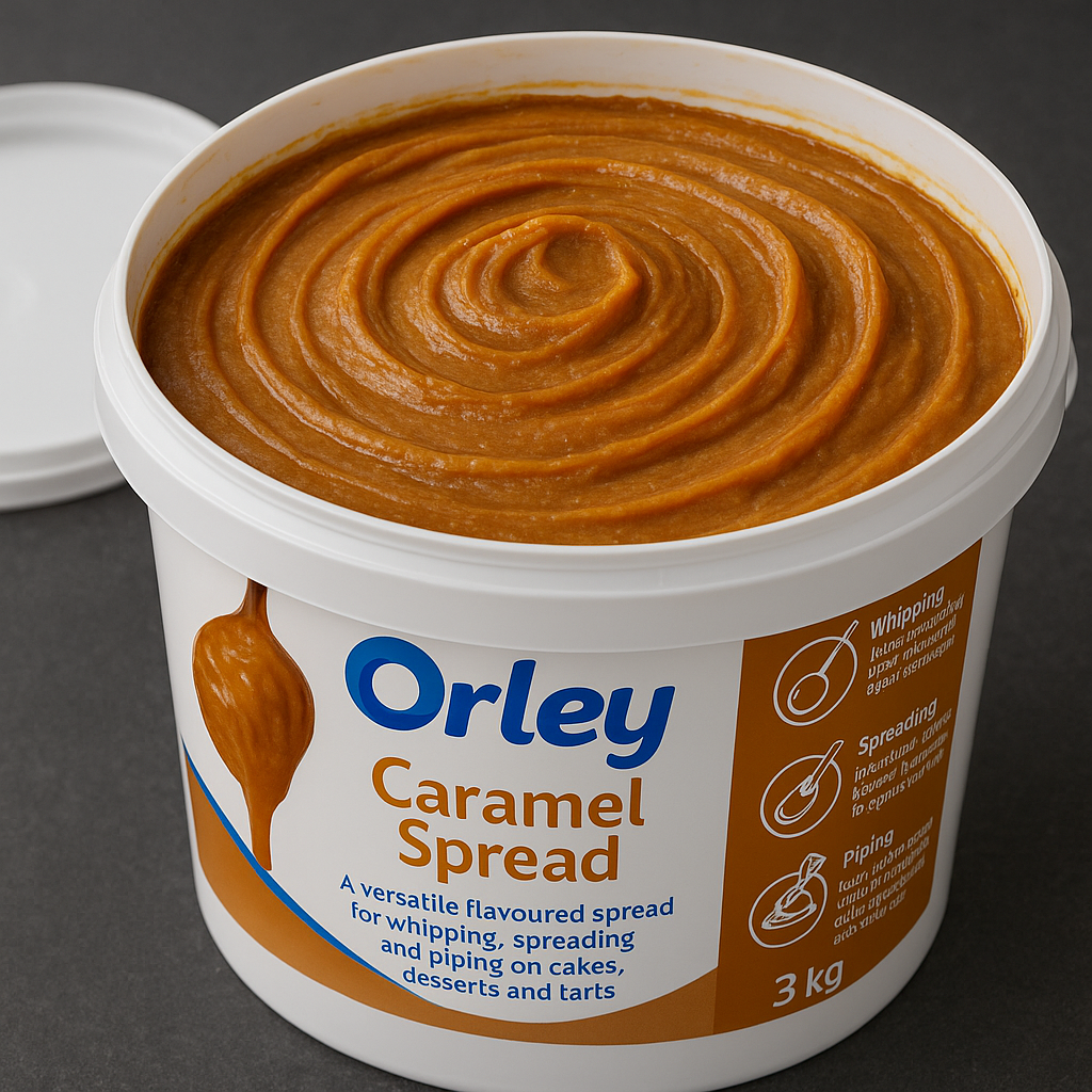 Orley Caramel Spread is a ready-to-use caramel filling supplied in a 3 kg pail for bakery and dessert use. It has a light caramel colour with a sweet caramel taste and aroma, and a smooth texture that spreads easily.