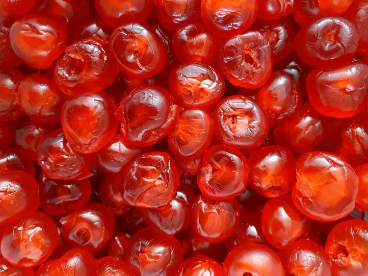 The glazed cherry on top. Real fresh cherries that are blanched and soaked in a sugar syrup. The moisture inside the cherries is drawn out by the sugar solution and in turn the cells of the cherry are filled with the sugar solution.