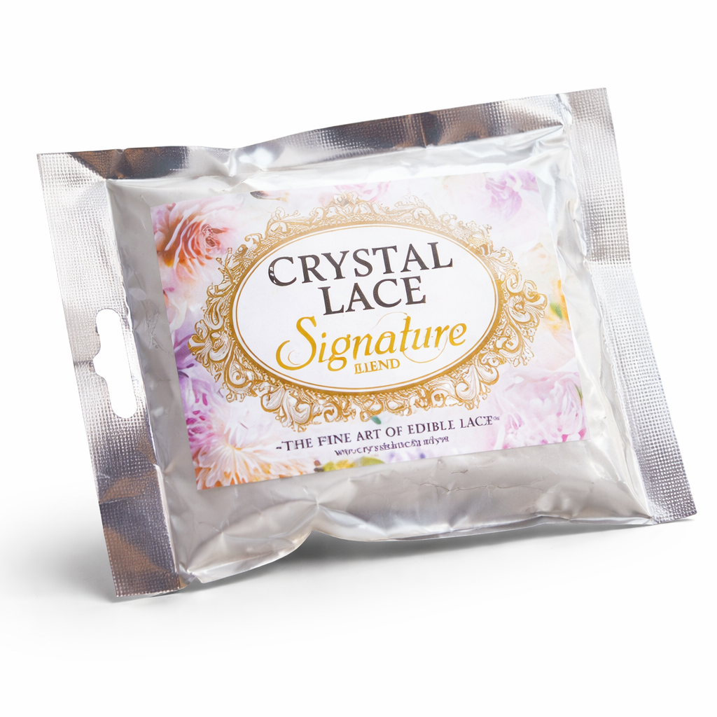 Crystal Lace Icing has revolutionized the cake and confectionery industry. Crystal Lace Signature Blend powder is the ability to create the most unique applications in decorative lace icing, one of which combines the whiteness and fine detail of icing, the stretch of edible wrapping around cakes and flexibility in one innovative product. When set our lace can be cut with scissors and draped like fabric onto/around a cake or plated dessert. No product is more versatile and able to make your cake decorations a simple breeze.