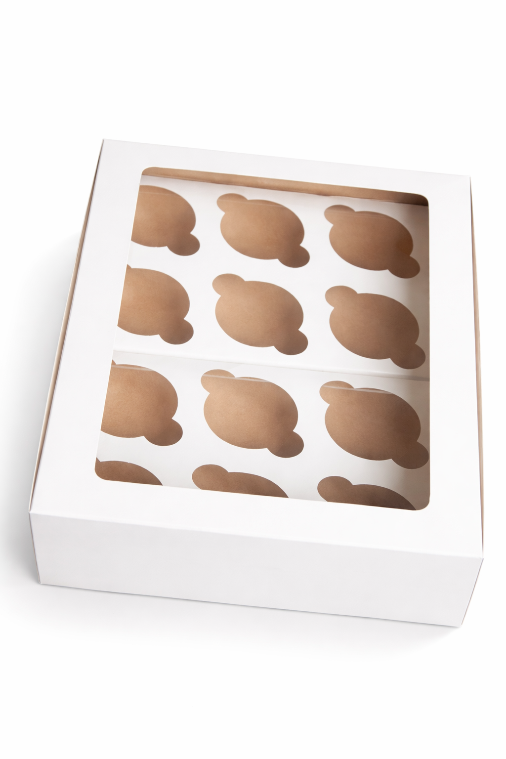 Each insert holds six cupcakes, fitting together to create a full 12-cupcake tray inside the box. The inserts can also be removed if needed, making the box flexible enough for larger cupcakes, muffins, doughnuts, brownies, cookies, or mixed treat boxes. The box is sold unfolded.