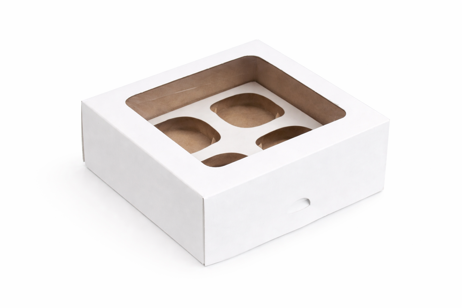 Fits four cupcakes. This is the variant with insert that holds your cupcakes in place with an insert. The box is also ideal for biscuit display. 6x6x3 inches.