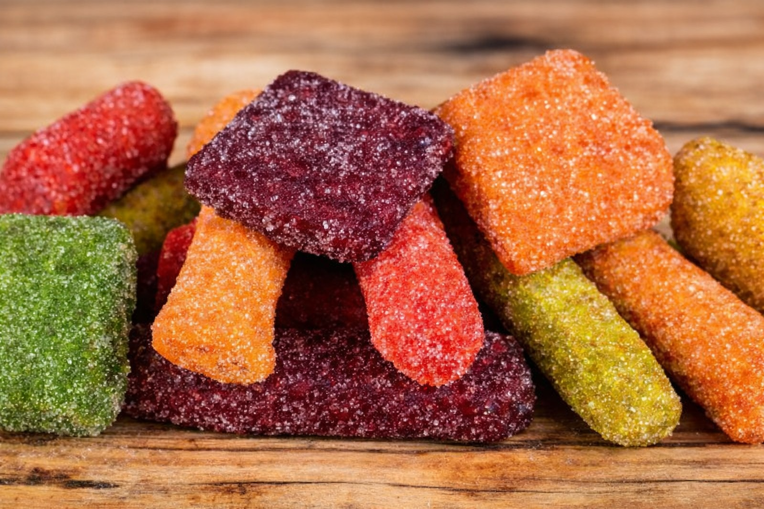 Ingredients: Pear; Peach; Apricot, Colourant: (Sunset Yellow E110), (Poneau E124),(Quinolene E104),(Green TF V4 E133, E104, E110 ), (Grape PPM E122, E133), Sugar, Flavourant: (Apricot, Fig, Peach, Grape, Strawberry)