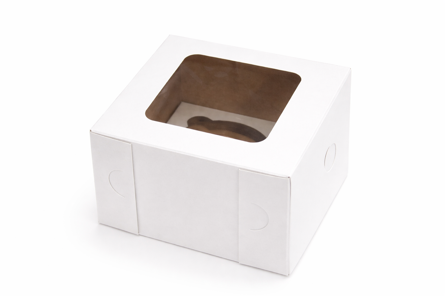 A slightly larger single window cupcake box with a slightly larger insert. Sturdy packaging to transport a single cupcake. Single window paperboard cupcake boxes are sturdy cardboard boxes designed to hold and display cupcakes while protecting them during transport. The clear viewing window showcases the cupcake inside, making them ideal for bakeries, gifts and special occasions.