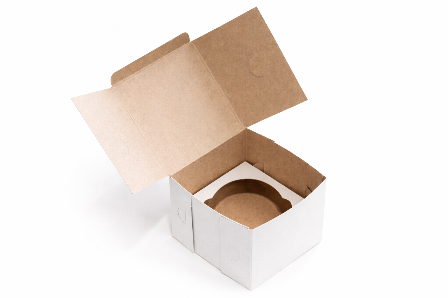White single cupcake box no window with inserts. Box is 8.5 x8.5 x7.5cm when folded. This box is ideal for items that are not on display, but require sturdy support during packaging.